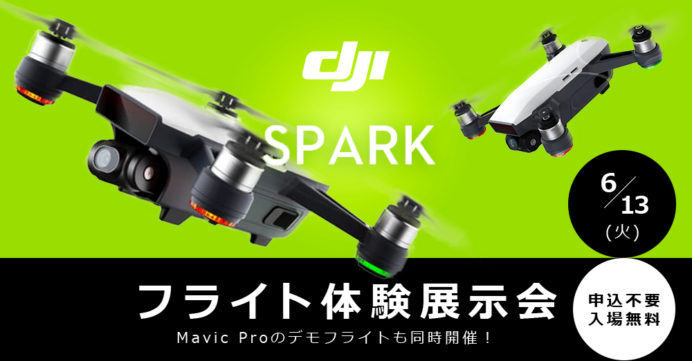 今回の展示会では、Sparkの実機をご用意。スマートフォンアプリ「DJI GO 4」を用いたフライトの実演を行う他、手のひらを使って操作するパームコントロールの体験も行って頂けます。上位モデル「Mavic Pro」のデモフライトも合わせて行いますので、両機種どちらを購入しようか迷われている方は疑問を一気に解決する絶好の機会です。是非この機会にご参加下さい!