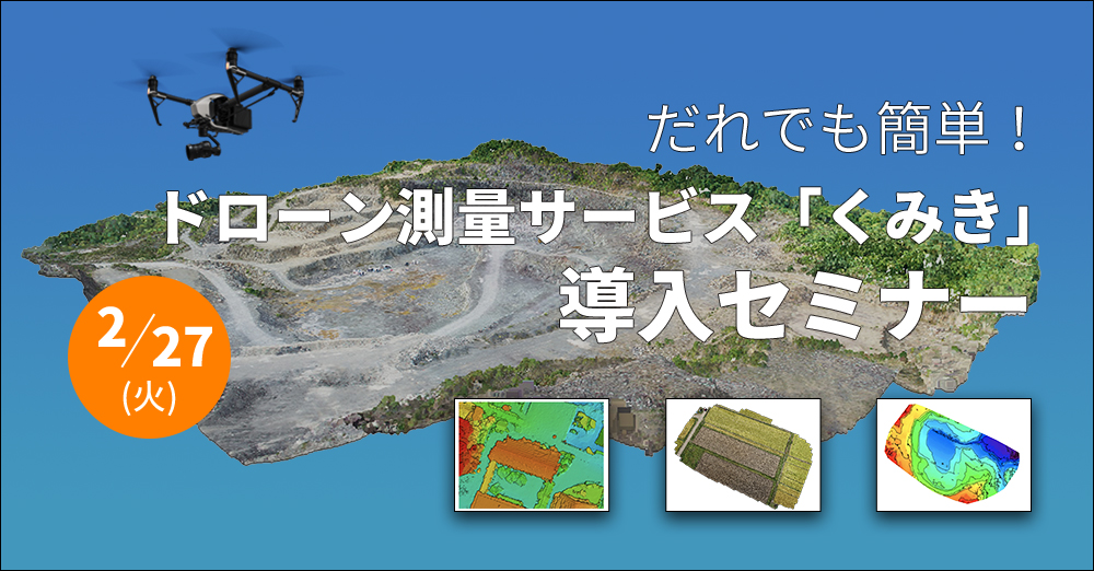 ホーム > セミナー・イベント情報 > 過去に開催されたセミナー・イベント概要一覧 > だれでも簡単!ドローン測量サービス「くみき」導入セミナー 2/27開催!