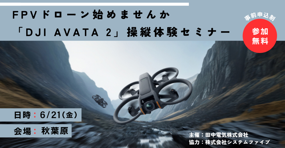 ドローンスクールを運営する田中電気本社にて、DJI Avata 2の操縦を体験できる『FPVドローン始めませんか「DJI Avata 2」操縦体験セミナー』を開催いたします。