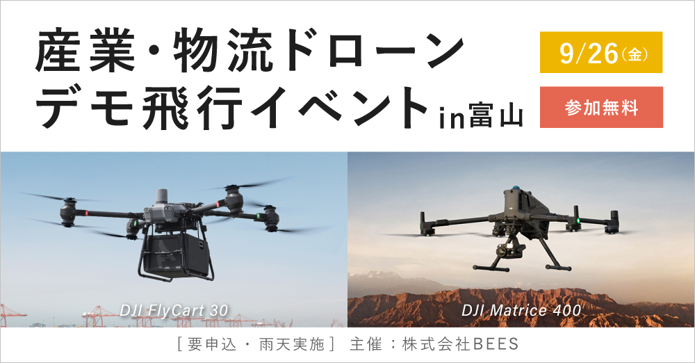 株式会社BEES主催、DJI産業機の最新モデル「Matrice 400」と、DJI物流機「FlyCart 30」のデモフライトを兼ねた特別イベントを富山県高岡市にて開催いたします。