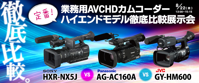 ホーム > セミナー・イベント情報 > 過去に開催されたセミナー・イベント概要一覧 > 定番!業務用AVCHDカムコーダーハイエンドモデル 徹底比較展示会 ~HXR-NX5J vs AG-AC160A vs GY-HM600~ 8/22開催!
