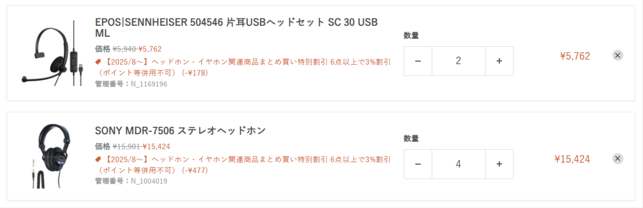 - 2つのまとめ買い割引の対象である場合、数量に応じた割引が適用されます。