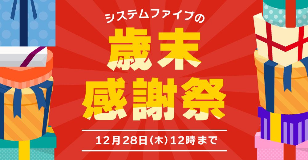 本年もシステムファイブをご愛顧いただいた皆様に感謝の気持ちを込めて、12/5~12/28(木)12時まで歳末感謝祭を開催いたします!