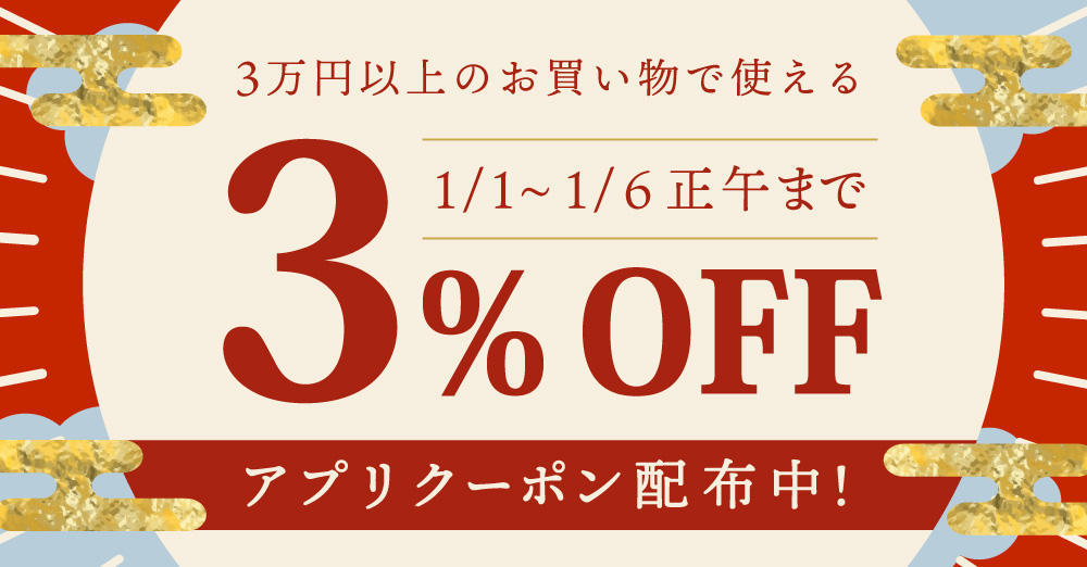 アプリ限定で、30,000円以上のご注文で全品3%引きになるお年玉クーポンを配布中です!