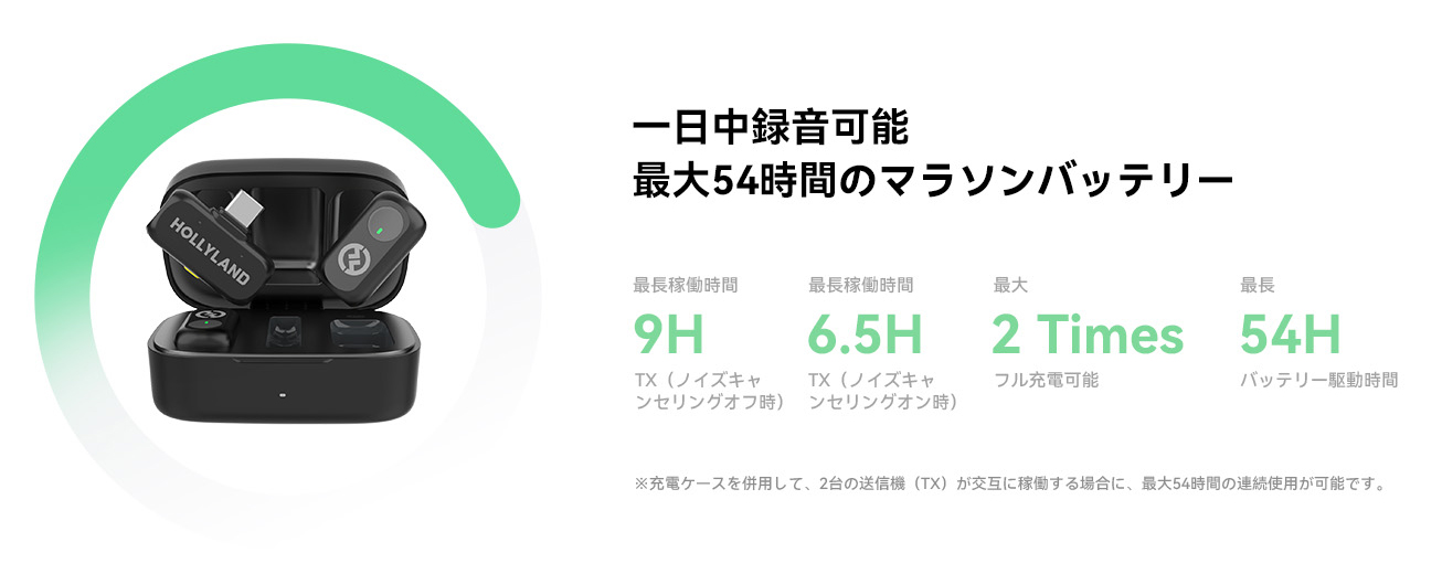 TX(送信機)は、1回の充電でノイズキャンセリングON時に約6.5時間、OFF時に約9時間使用可能。充電ケースでシームレスに切替え、最大54時間の連続運用を実現します。