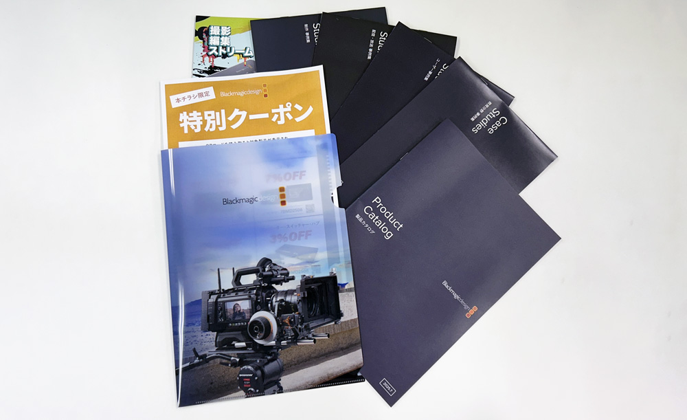 クーポン以外にも、ブラックマジックデザイン×システムファイブのコラボクリアファイルや製品パンフレットなどがセットになっています。