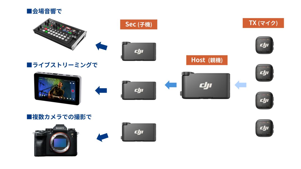 DJI Mic 3は4トランスミッター 8レシーバー同時接続、4チャンネルに対応しています。