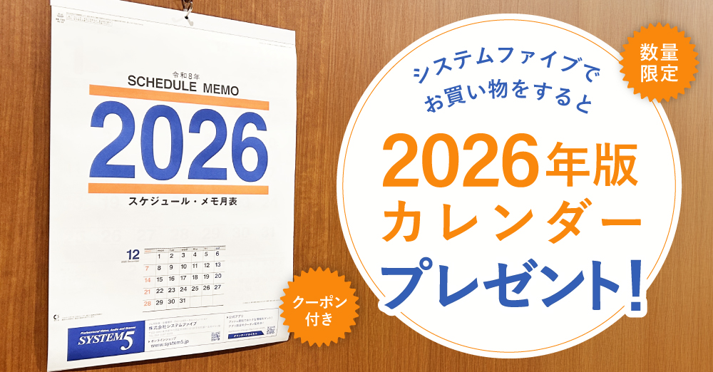 と、大好評のシステムファイブ壁掛けカレンダー2026年版を、2025年11月1日(土)以降にご注文をいただいたお客様に先着で、ご注文商品と一緒に同梱してお届けいたします!
