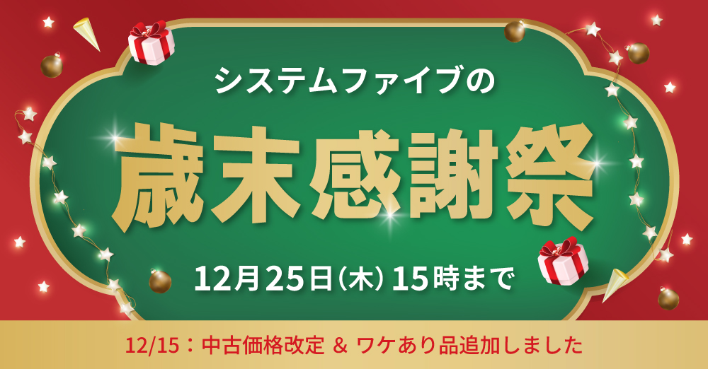 本年もシステムファイブをご愛顧いただいた皆様に感謝の気持ちを込めて、12/12(金)16時~12/25(木) 15時まで歳末感謝祭を開催いたします!