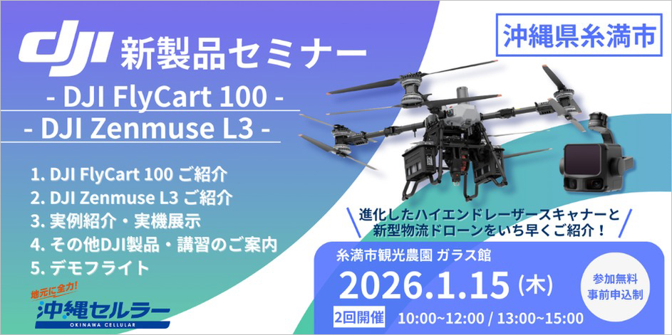 沖縄セルラー電話/沖縄ドローンサービスセンター 主催 DJIより新たに登場した新型物流ドローン「DJI FlyCart 100」及びDJI Matrice 400に搭載可能なハイエンドレーザースキャナー「DJI Zenmuse L3」の紹介・展示を中心としたセミナーを糸満市にて開催いたします。