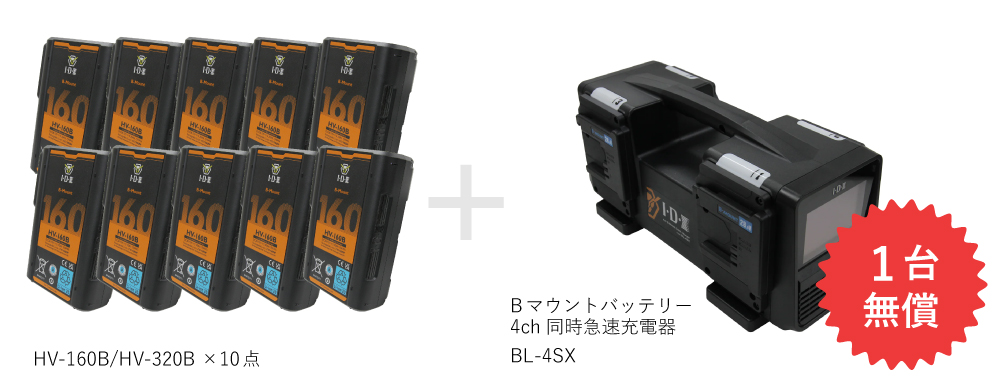 対象のHV-160B/HV-320Bを10本購入すると、Bマウントバッテリー 4ch同時急速充電器「BL-4SX」を1台無償でプレゼントいたします。