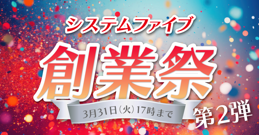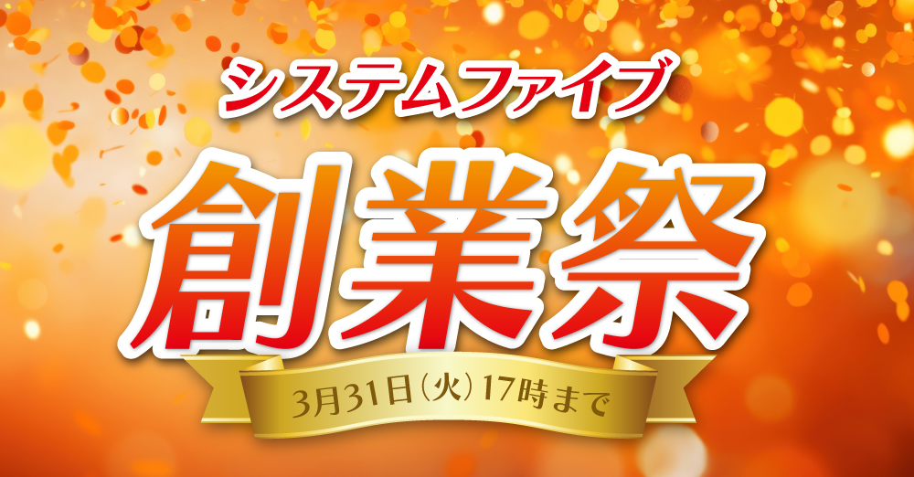 皆様のご愛顧に感謝の気持ちを込めて、3月31日(火)17時までシステムファイブ創業祭を開催中です!
