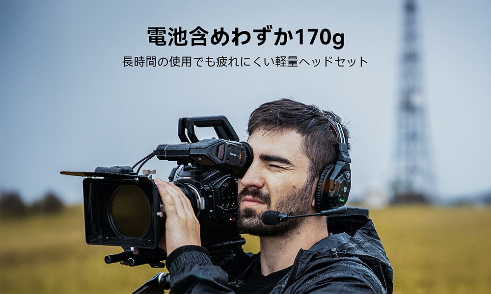 ヘッドセットはバッテリー込みで約170gと軽量で、長時間の撮影・イベント現場でも快適に装着できます。