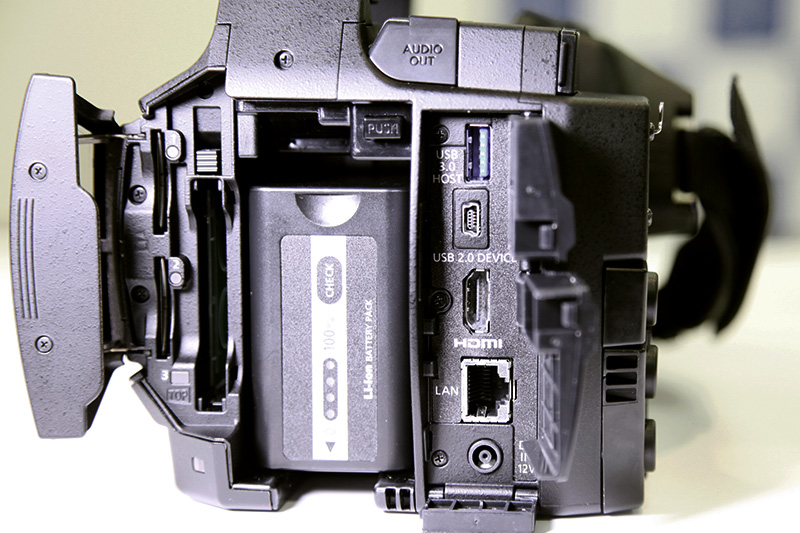 通常のグリップ部に1つ、トップハンドルに1つ、そして本体正面下部に1つの計3つが用意されています。 3つ目のボタンは、ショルダーカメラなどでおなじみの位置にあるので、ショルダーカメラに慣れたカメラマンの方でも自然なスタイルでオペレートが可能です。メディアスロット