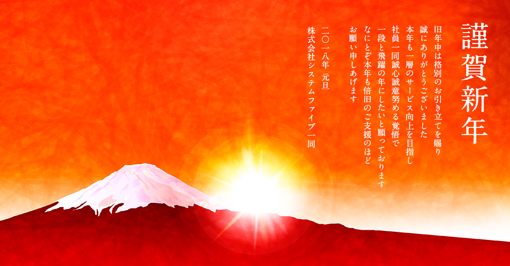 【新年のご挨拶】あけましておめでとうございます ニュース 投稿:2018年1月1日 旧年中は格別のお引き立てを賜り誠にありがとうございました 本年も一層のサービス向上を目指し社員一同誠心誠意努める覚悟で 一段と飛躍の年にしたいと願っております なにとぞ本年も倍旧のご支援のほどお願い申し上げます 平成30年元旦 株式会社システムファイブ一同